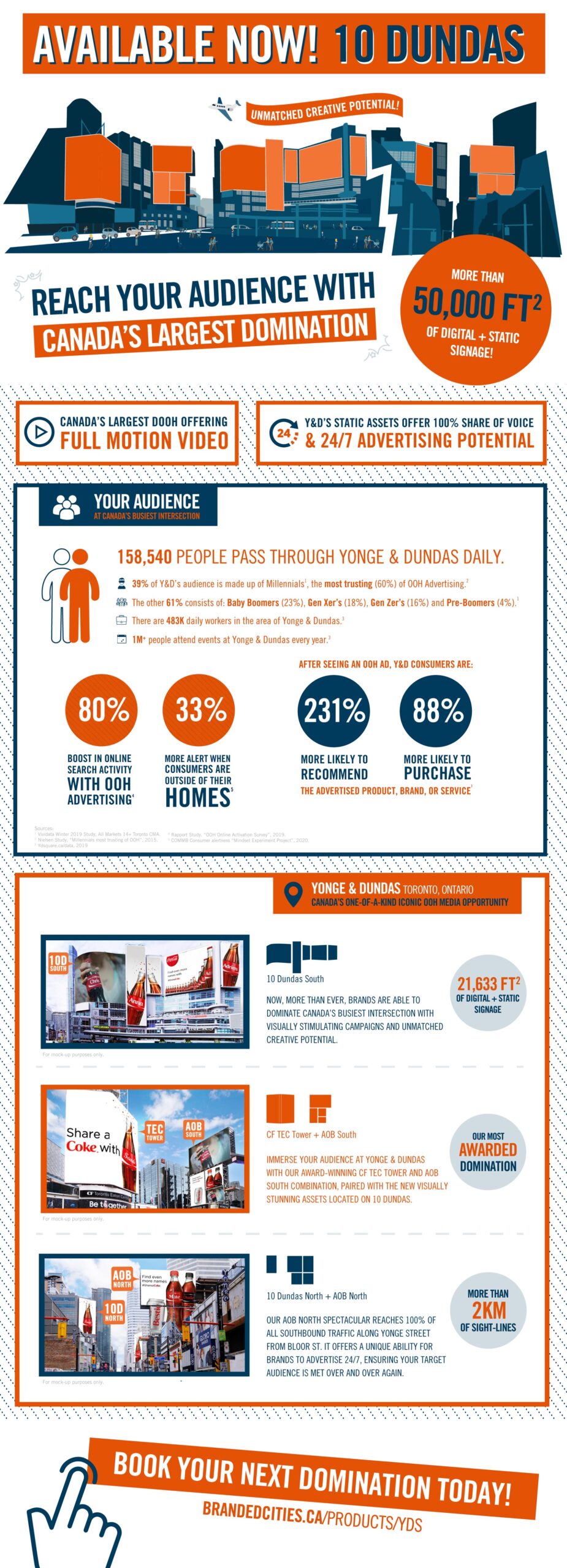The addition of 10 Dundas East aligns perfectly with the success of Branded Cities’ 20-year celebration in the North American Out-of-Home Industry. By anticipating and meeting specific needs and interests of advertisers, the partnership with BentallGreenOak further solidifies Branded Cities’ position at the forefront of the OOH Industry. The new engagement will commence upon the expiration of the existing media agreement.